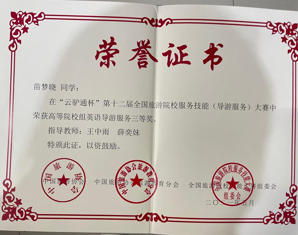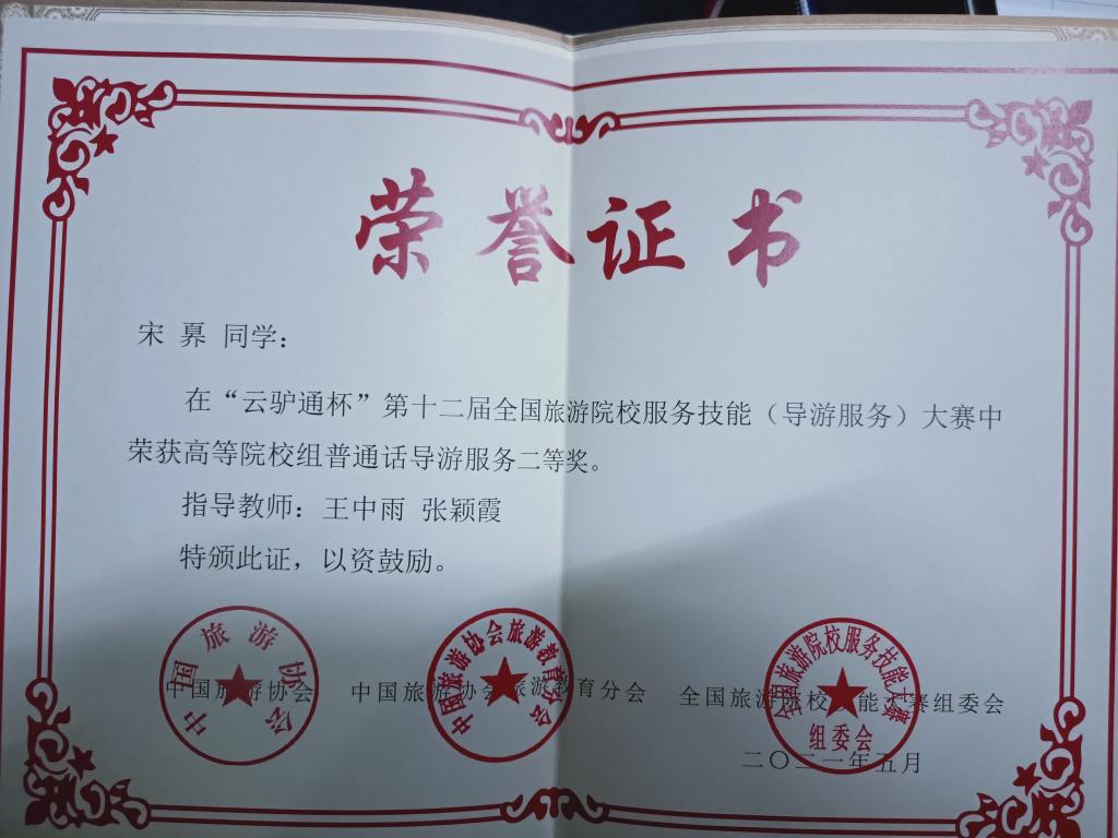 516日,云驴通杯第十二届全国旅游院校服务技能(导游服务)大赛在青岛酒店管理职业技术公司落下帷幕。公司派出3名参赛选手参加了高校普通话组和英语组的比赛。经过四天紧张而激烈的角逐,公司参赛选手成绩喜人,其中:宋奡获高校(普通话组)二等奖、刘梦云(普通话组)和苗梦晓(英语组)获三等奖的好成绩。