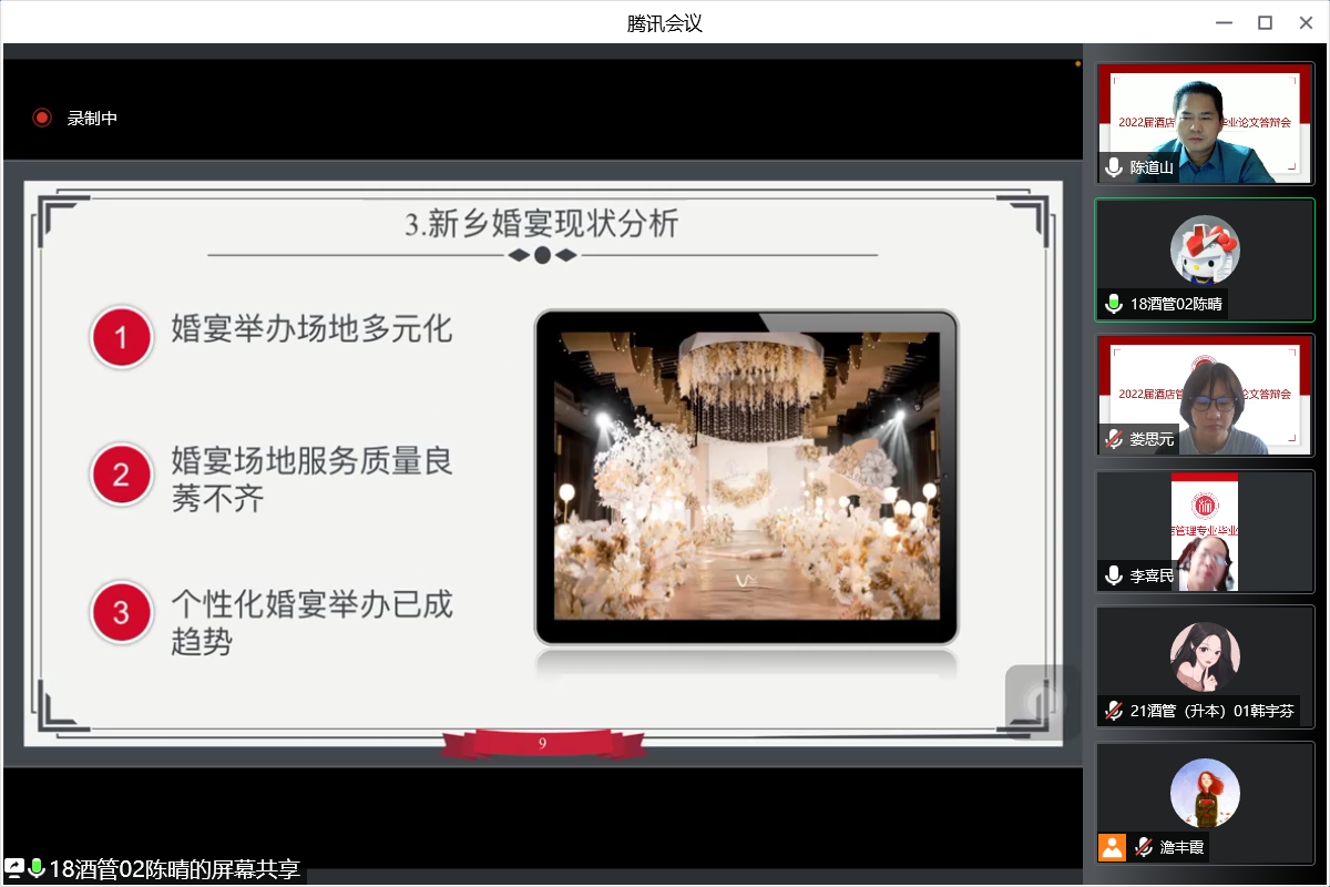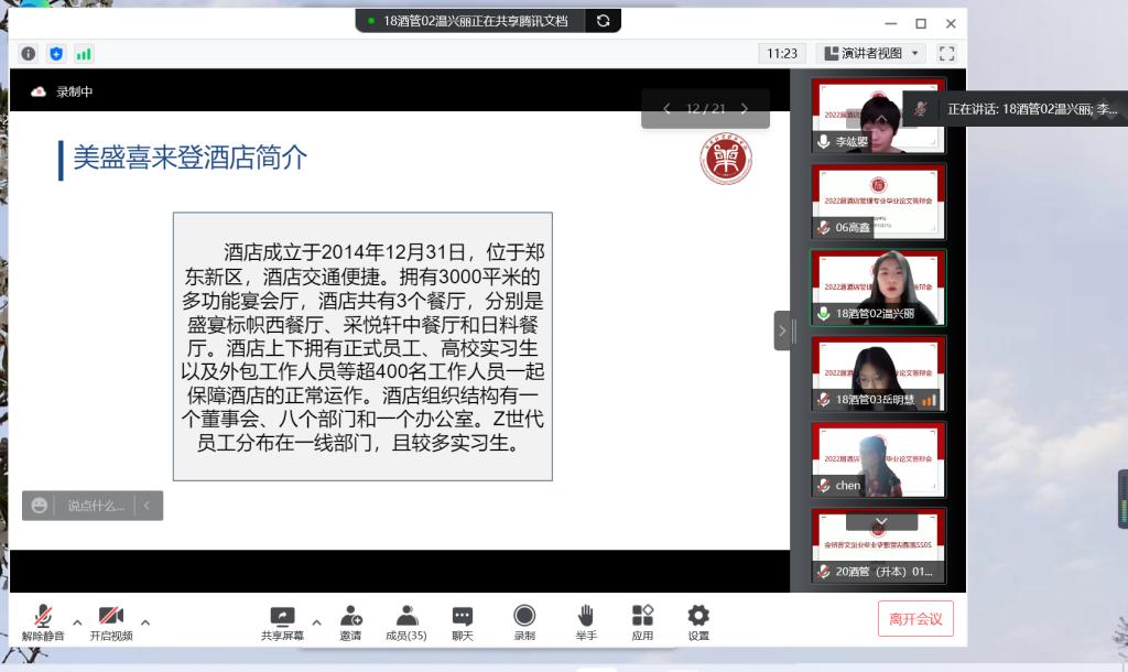 为切实保障本科教学质量,最大限度降低疫情对员工毕业的影响,5月21日,2022届酒店管理本科专业顺利完成187名毕业生毕业论文答辩工作。本次答辩师生全部通过腾讯会议采用线上方式进行,分为7个答辩组,经理王德静、副经理王中雨等42位教师参与全程答辩。