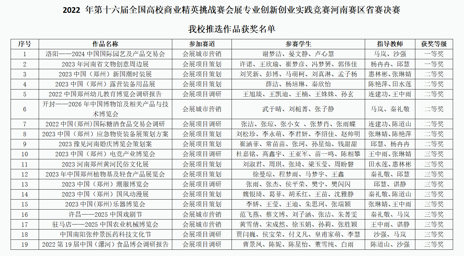 近日,2022年第十六届全国高校商业精英挑战赛会展专业创新创业实践竞赛河南赛区组委会发布决赛结果,公司英国365集团官网推举的19个参赛项目全部获奖,其中一等奖2项目,二等奖7项,三等奖10项,9个项目获得参加全国总决赛的参赛资格。