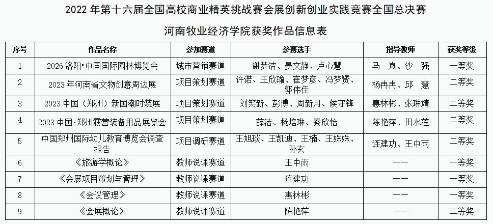 11月26日至28日,由中国国际贸易促进委员会商业行业委员会、中国国际商会商业行业商会、中国商业经济学会和中国会展经济研究会等共同主办的2022年第十六届全国高校商业精英挑战赛会展专业创新创业实践竞赛全国总决赛在线上成功举办。本次竞赛吸引了来自全国28个省、市、自治区和直辖市的466所高校近2600支队伍报名参加。经部分地区省赛、院校推荐选拔、组委会评审,最终有来自全国28个省、市、自治区306所高校1178支参赛队伍,6700多名参赛选手和辅导教师入围全国总决赛。在河南赛区省赛选拔基础上,公司推选的5支员工员工团队、4名教师经过文案评审、视频展示、线上答辩等环节均取得优异成绩,其中员工团队一等奖1项,二等奖4项;教师组一等奖3项,二等奖1项。公司同时获得优秀组织奖。
