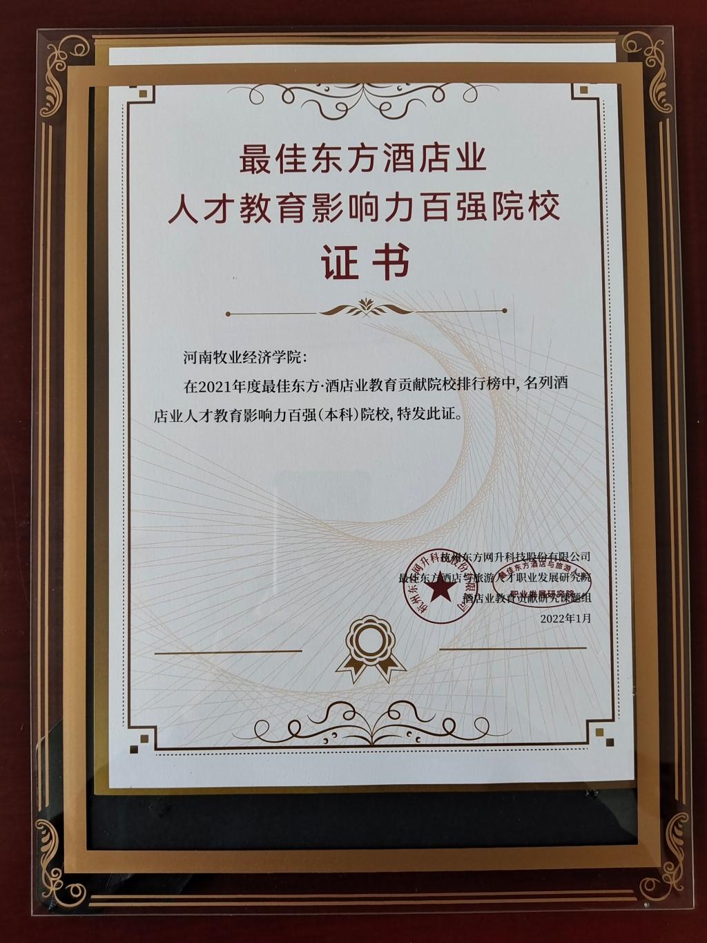 由国内权威专业旅游服务业招聘求职平台——最佳东方主办的首届“最佳东方酒店业职教影响力百强院校”排行近期在杭州揭晓。在2021年度最佳东方•酒店业教育贡献院校排行榜中,公司荣获酒店业人才教育影响力百强(本科)院校。