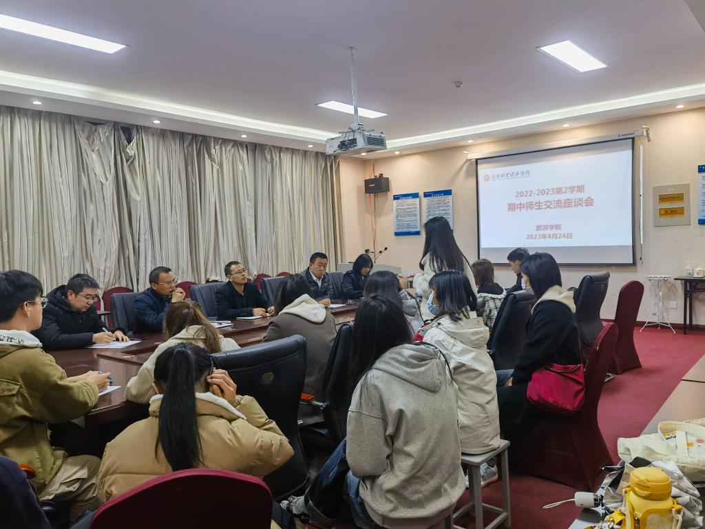 2023年4月24日13点,英国365集团官网在C423会议室召开2022-2023学年第2学期期中教学专题师生座谈会,王中雨副经理、教学办主任、各教研室主任及各专业班级员工代表参加了会议。