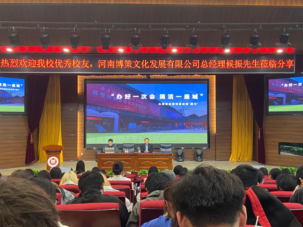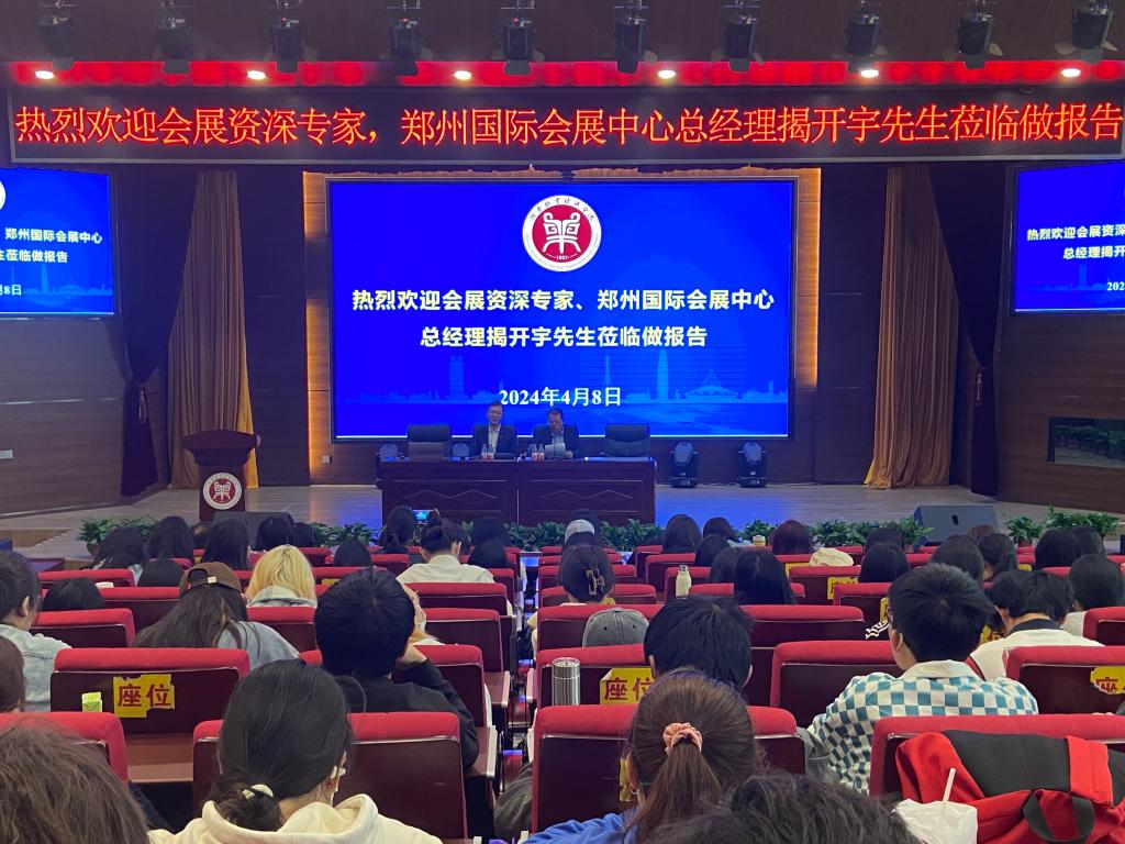 4月8日下午,资深会展人、郑州国际会展中心总经理揭开宇、公司优秀员工、河南博策文化传播有限公司总经理候振走进公司,在一号教学楼合100报告厅为公司师生带来精彩分享,公司副经理王中雨、会展教研室全体教师、2023级会展专业全体员工130多人全程参加分享交流。