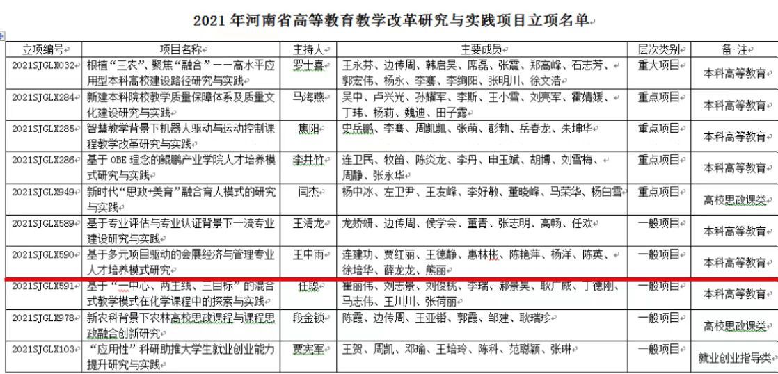近日,河南省教育厅发布《关于公布2021年度河南省高等公司产品改革研究与实践立项项目的通知》(教高〔2022〕138号)》,公司王中雨副经理申报的《基于多元项目驱动的会展经济与管理专业人才培养模式研究》本科教育类项目成功获批。