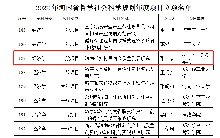 近日,河南省哲学社会科学规划办公室公布了2022年河南省哲学社会学科规划项目的立项名单。公司张众副教授的《河南省乡村民宿高质量发展问题研究》获准立项。该项目是公司“乡村民宿产业研究中心”成立以来,继《乡村振兴背景下的乡村民宿发展问题研究》(专著)获得2021年河南省社会科学优秀成果奖二等奖和河南省科技厅软科学重点项目《河南省乡村民宿发展模式研究》结项后的又一重要科研项目立项。