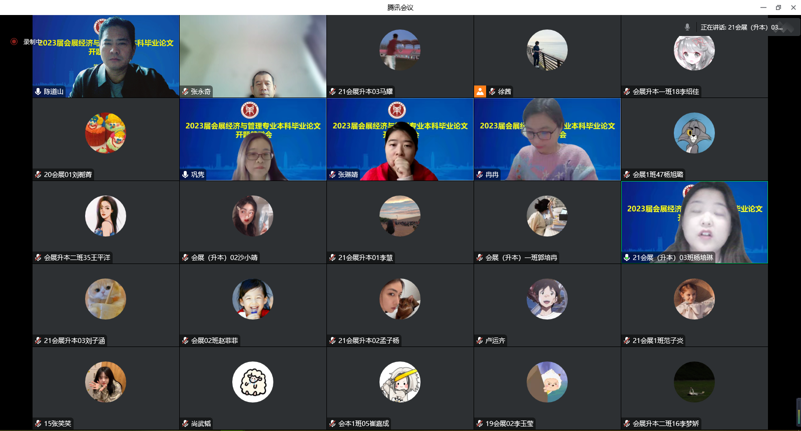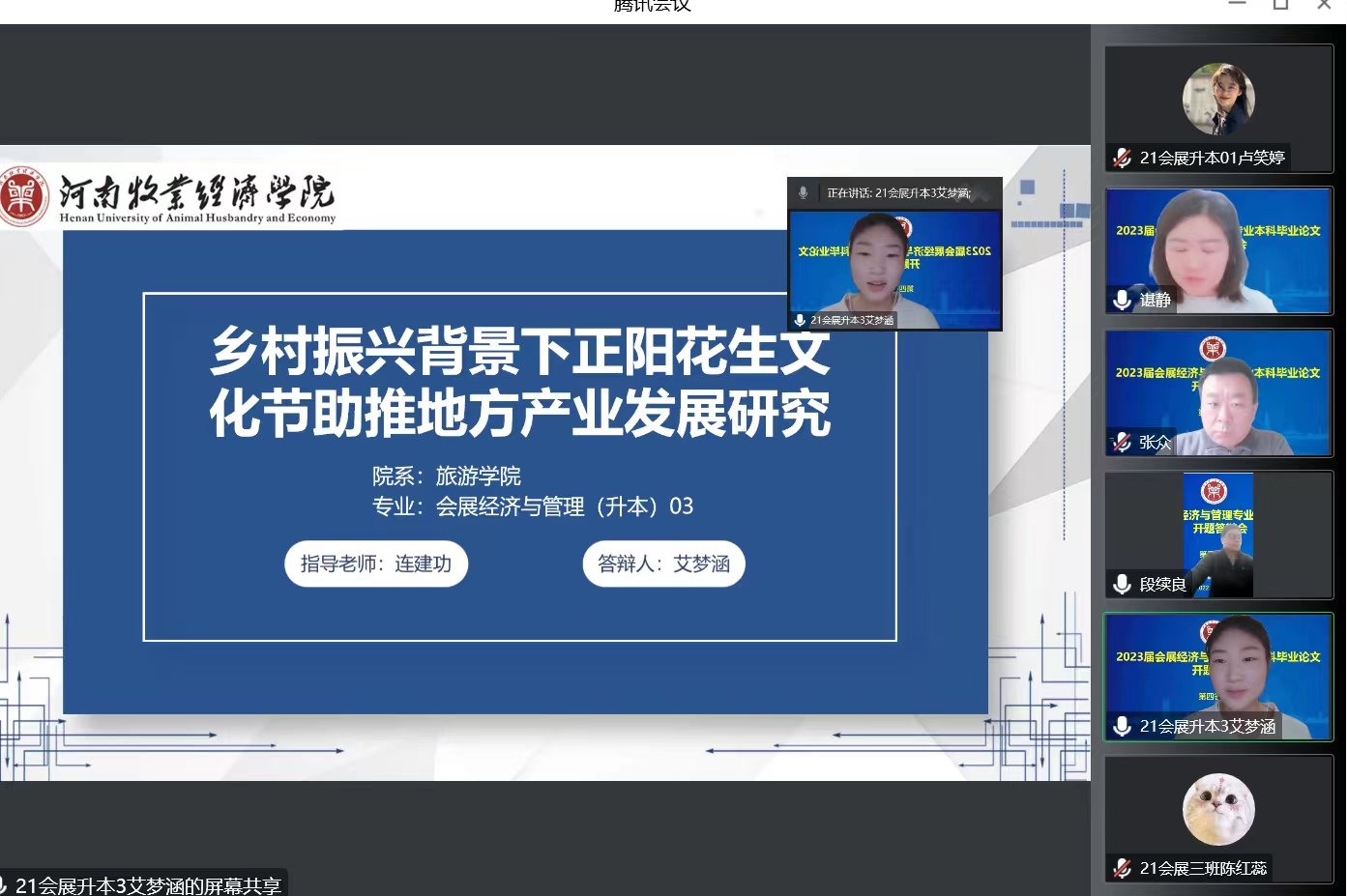 根据《英国365集团官网本科毕业论文(设计)工作条例》和《2023届本科毕业论文(设计)工作实施方案》,2022年11月12日,公司2023届会展经济与管理本科专业毕业论文开题答辩工作通过腾讯会议线上顺利进行,本次答辩共分8个答辩组,287名员工、48名指导教师参与答辩会。