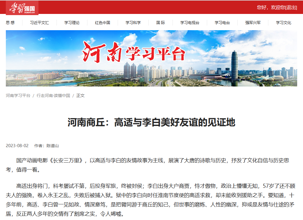 8月2日,“学习强国”河南学习平台发表了公司陈道山副经理的署名文章《河南商丘:高适与李白美好友谊的见证地》,这是学习强国平台首次发表公司教师的文章。文章继7月28日《商丘日报》刊发后,经地方宣传部门遴选推送至学习强国平台。