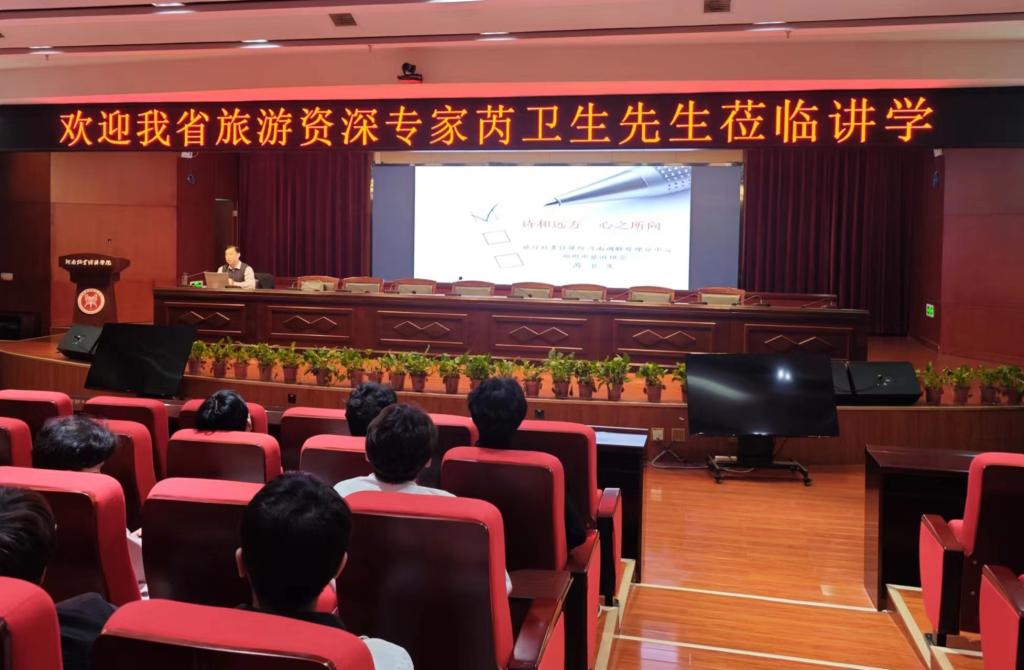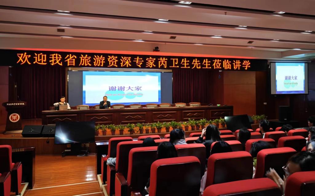 讲座伊始,芮主任就如何让文旅融合,诗与远方“牵手”前行展开讲解,他指出文化是旅游的灵魂,旅游是文化的载体,坚持以文塑旅,以旅彰文,推进文化和旅游深度融合发展。旅游要发展,服务是关键,用心服务,才能温暖旅途,照亮旅游产业的前景。紧接着芮主任提出旅游文明与公民道德之间的关系,让文明旅游深入人心,成为公民旅游行为的标尺。最后他向师生详细阐述了自己的工作重心,他指出安全是旅游的生命线,旅行社对于游客人身财产安全是第一责任人,是游客安全保障义务的最有力的执行者和保障者,同时游客自己要具备安全意识。芮主任建议公司多进行旅游安全教育,培养员工安全意识,适当在课程中融入安全知识,对员工今后职业工作中的安全素养起到引领作用。