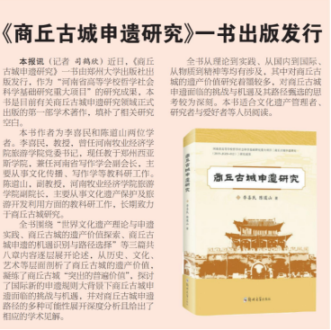近日,学习强国平台刊发了《商丘古城申遗研究》一书出版发行的新闻报道(10月20日的《商丘日报》报道了《商丘古城申遗研究》一书出版发行的新闻)。