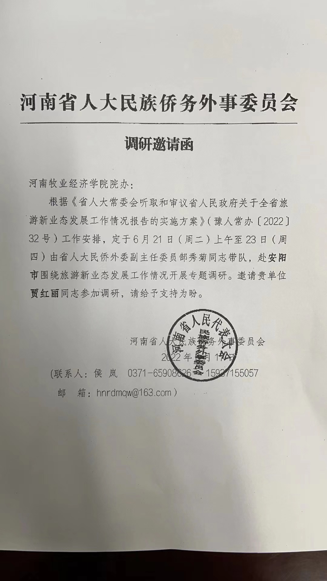 6月21日—23日,应河南省人大民族侨务外事委员会邀请,公司贾红丽老师随同省人大常委会调研组走进安阳就旅游新业态发展现状开展为期三天的调研调研组一行先后深入安阳县航空科普馆、林州市石板岩镇等地,实地察看民宿服务、乡村旅游等具有特色的旅游新业态发展工作情况。