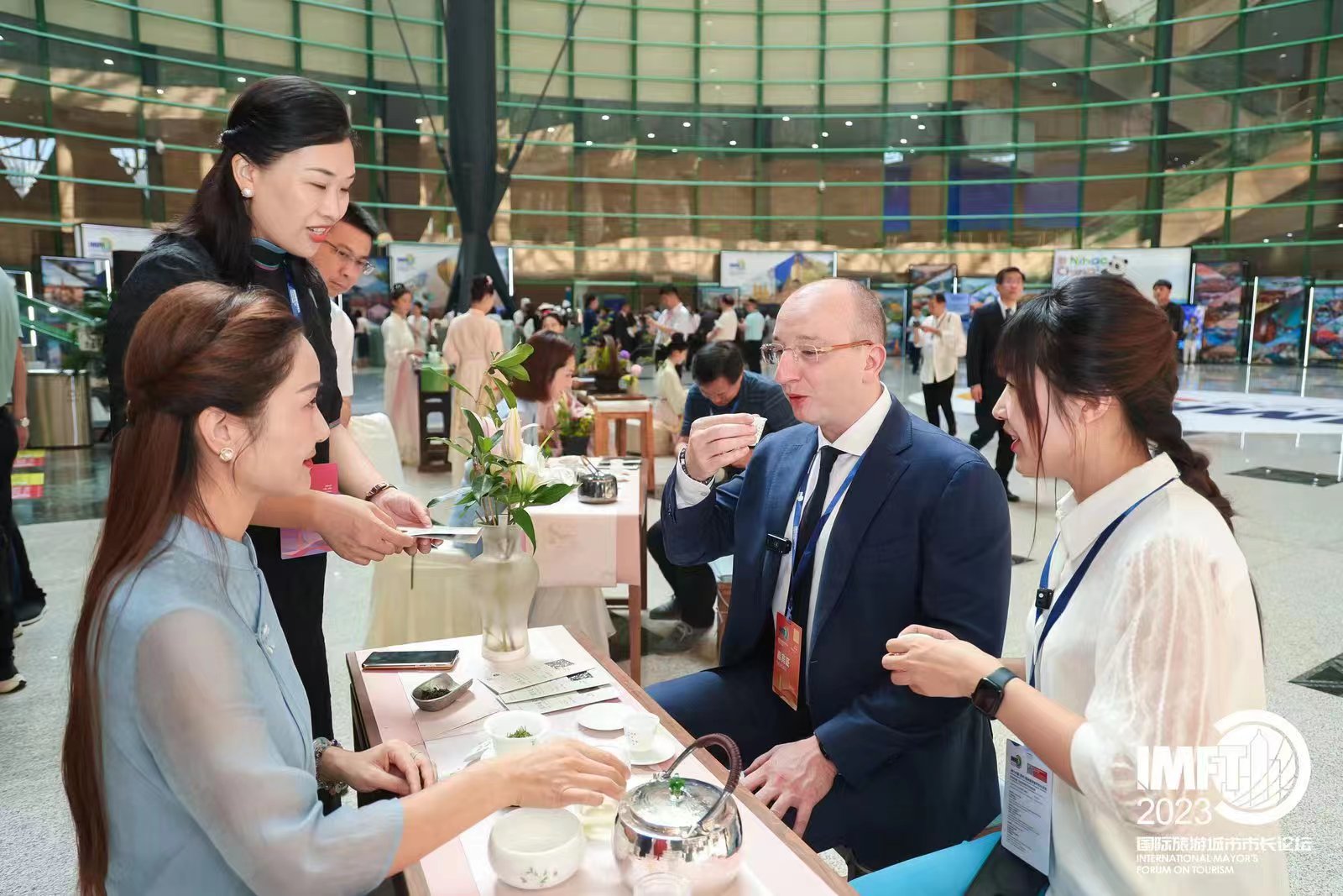 本次论坛,公司教师贾红丽组成的中国茶艺师团受邀承接市长论坛的茶歇服务。论坛期间,贾红丽教师团队为国际友人表演了信阳毛尖茶艺,普及推广中原茶文化!与会人员被中国六大茶类及茶器具展所吸引,一杯杯品饮中国茶;贾老师为与会嘉宾讲授品鉴方法和中国茶礼仪,莫斯科市市长办公室和政府第一主任、莫斯科市旅游委员会主席科兹洛夫· 叶夫根尼品尝了信阳毛尖等多款茶类,学习中国茶道,时时竖起大拇指,对于中国文化的喜爱之情溢于言表。