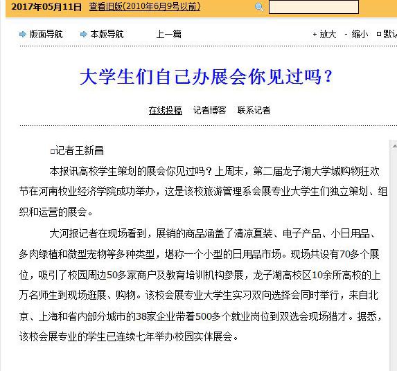 5月11日《大河报》以《老员工们自己办展会你见过吗?》为题,报道了我系会展专业实训项目:老员工购物狂欢节暨会展专业就业实习双选会的基本情况,彰显了我系专业实践教学的特色。相关链接http://newpaper.dahe.cn/dhb/html/2017-05/11/content_145449.htm