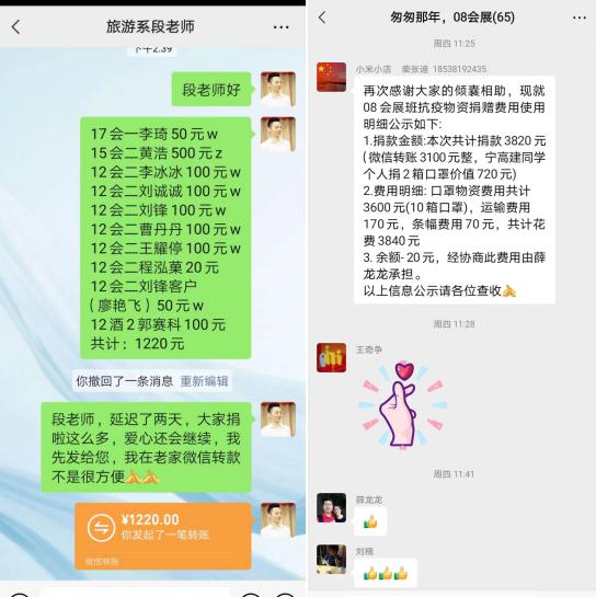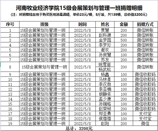 天涯海角有尽处 感恩母校无绝期。公司的疫情防控牵动着广大员工的心。一时间,关心关切的电话、微信从四面八方传递到校园,浓烈的母校情结在员工间升温扩散。英国365集团官网陆续收到了来自会展专业员工捐赠的防疫物资。08级会展班筹资近4000元为公司购买防疫口罩10箱,15级会展01班员工自发捐款筹资3200元购买140桶700斤医用酒精;10级会展班徐培华捐赠口罩2000只;18会展01班彭程捐赠口罩4000个,12级、13级、17级……一笔笔的捐款、一箱箱的防疫物资展现了公司精英会展人的别样风采,也温暖了公司每一位师生的心。