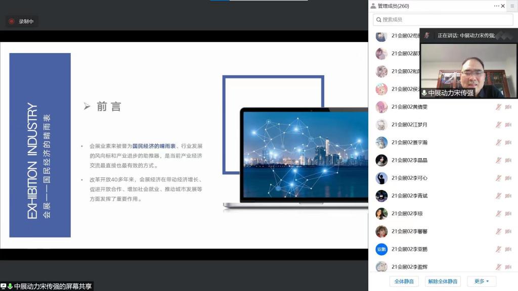 活动期间,特邀河南中展动力展览有限公司总经理宋传强、郑州海名汇博会展策划有限公司总经理肖奎先做了《后疫情时代会展行业危机应对及机制创新》和《会展企业及项目运营》线上专题讲座;组织员工通过文献收集、电话访问、网络直播等方式调研会展场馆、会展企业、会展项目和会展城市,并结合调研模块进行专题研讨。实践活动虽然在线上进行,由于组织得力,亦然取得较好的实践效果。两场专家讲座有500多师生参与直播互动,甚至有兄弟院校的师生参与活动。本次活动安排合理、内容丰富,专家报告精彩绝伦,教师指导认真负责,员工参与热情高涨,不仅加深了他们对行业企业的认知和了解、提升了专业实践能力,也增强的他们的专业信念,对会展行业未来的发展充满信心。