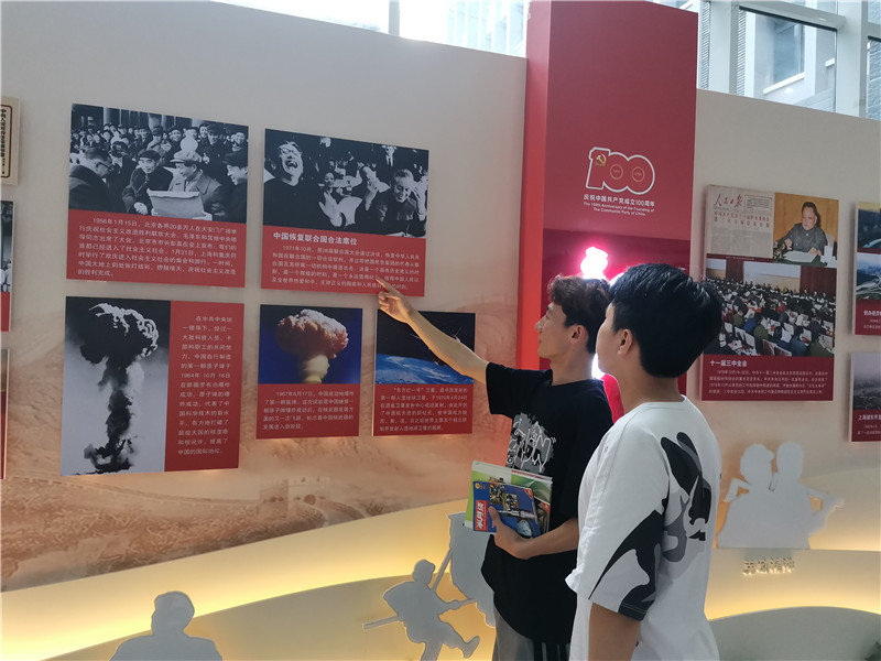 本次主题展览共分为四个板块,分别是:开天辟地,完成救国大业;改天换地,完成兴国大业;翻天覆地,推进富国大业;惊天动地,实现强国大业。本次展览以一百年间中国共产党的历史发展为主线,全方位、全过程、全景式展现了中国共产党波澜壮阔的百年历程。同学们穿梭在各板块中,边走、边看、边学,相互讨论交流,共同追忆风华正茂的百年大党筚路蓝缕、奠基立业的峥嵘岁月,感受矢志践行、初心使命的家国担当和理想信念。