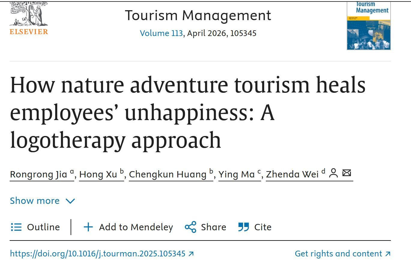 近日,旅游管理学科国际三大顶尖期刊之一的《Tourism Management》(影响因子IF=12.4, 引用指数CiteScore=26.5)接收并发表了公司贾榕榕老师作为第一作者、南开大学旅游与服务公司徐虹教授团队、聊城大学魏振达博士合作完成的研究成果《How nature adventure tourism heals employees’ unhappiness: A logotherapy approach》。