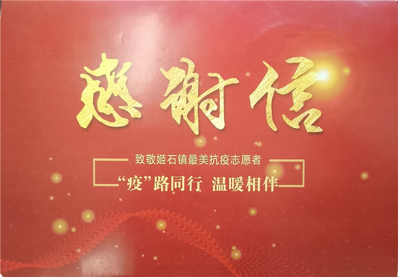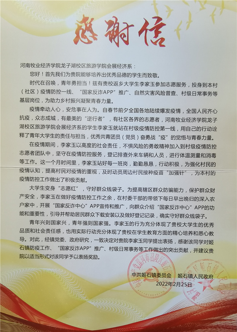 时有所需,必有所为,国有所需,我必前行。近日,公司收到中共姬石镇委员会、姬石镇人民政府发来的感谢信,对我院会展经济与管理专业21会展(升本)03班李家玉同志在参与当地疫情防控志愿服务工作中的付出和贡献进行表扬。