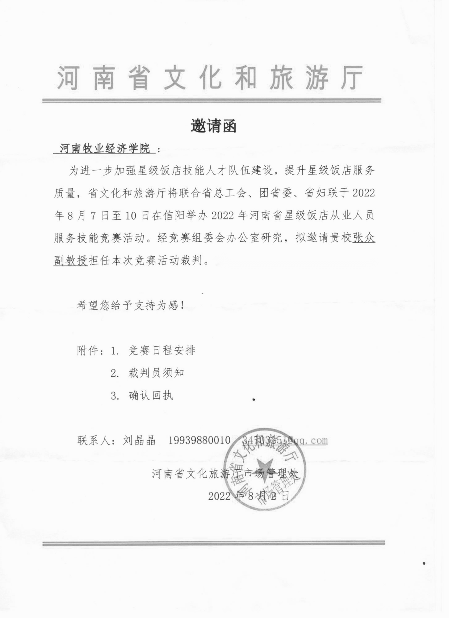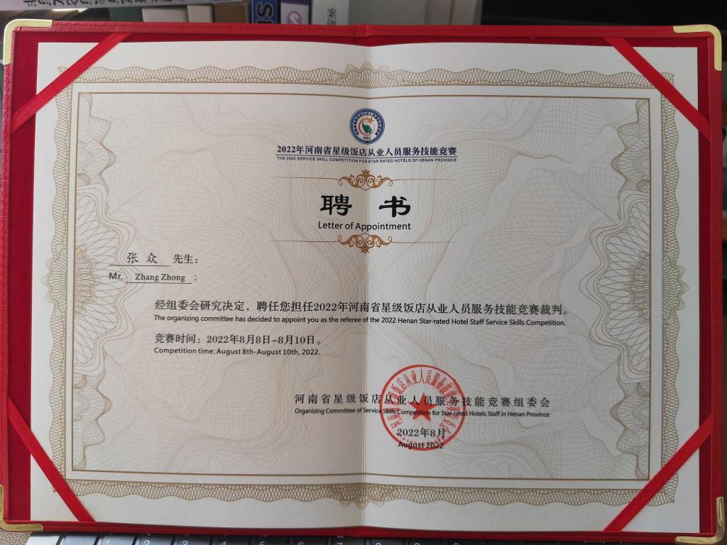 近日,公司张众副教授受河南省文化和旅游厅邀请,在刚刚结束的2022年河南省星级饭店从业人员服务技能竞赛中担任裁判员,圆满完成大赛执裁任务。