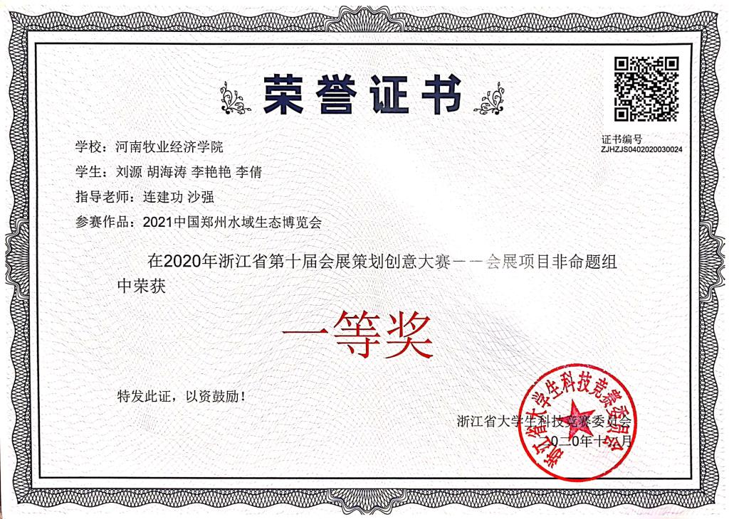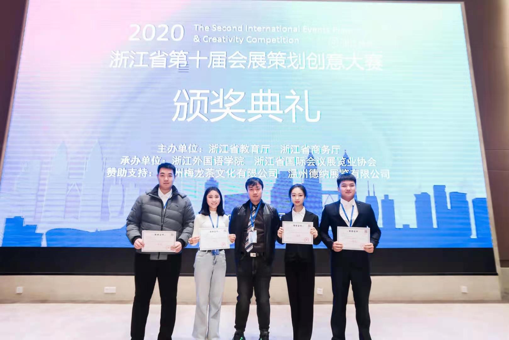 20201218日,由浙江省教育厅和浙江省商务厅共同主办,浙江外国语公司和浙江省国际会议展览业协会共同承办的2020第十届浙江省会展策划创意大赛颁奖典礼在杭州浙江外国语公司举行。公司英国365集团官网推荐的《2021中国郑州水域生态博览会》项目荣获非命题组一等奖,沙强博士携项目团队成员刘源、胡海涛、李倩、李艳艳4位同学参加颁奖典礼。